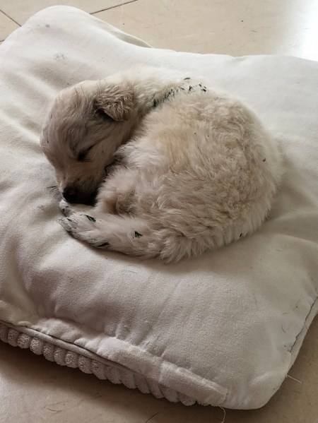 Mag ik jullie voorstellen aan Knut, bijna 2 jaar oud en gevonden in een greppel op het Spaanse platteland. Moederziel alleen, vol met teken en groene verf, had hij de aandacht getrokken van mijn man. Hij was in de greppel gevallen en kon er niet zelf uit komen. Die dag veranderde het leven van dit hondje voorgoed. Hij paste precies op 1 hand, zo klein was hij.