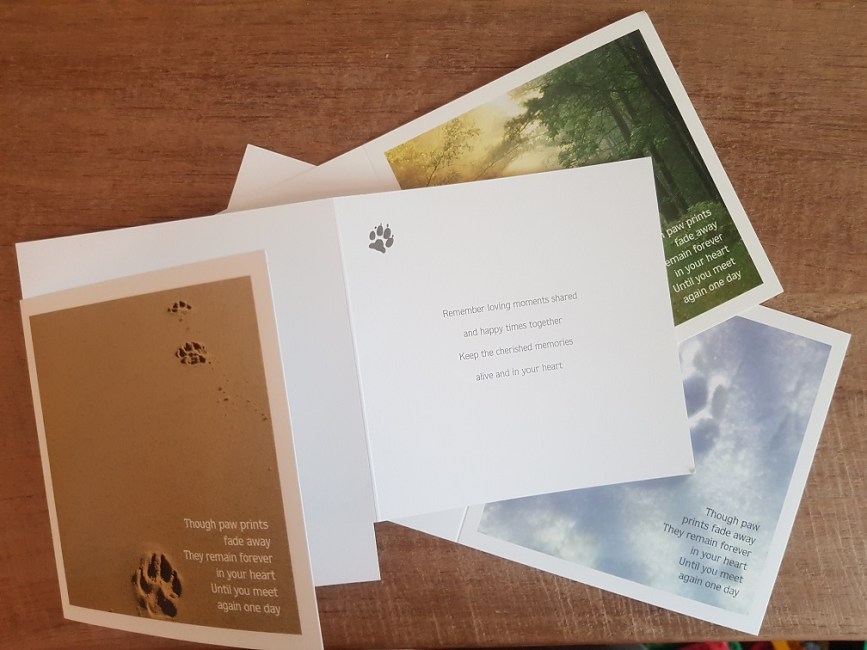 Speciaal voor dierenklinieken, hondenpensions of oppas en uitlaatdiensten. Een toepasselijke kaart op dat verdrietige moment geeft veel steun. Eigen ontwerp. Levering binnen 7 dagen. De kaarten zijn vervaardigd op FSC papier, afmetingen 22 x 11 cm (dubbele kaart). Engelse tekst op de voorkant, en binnenkant blanco.